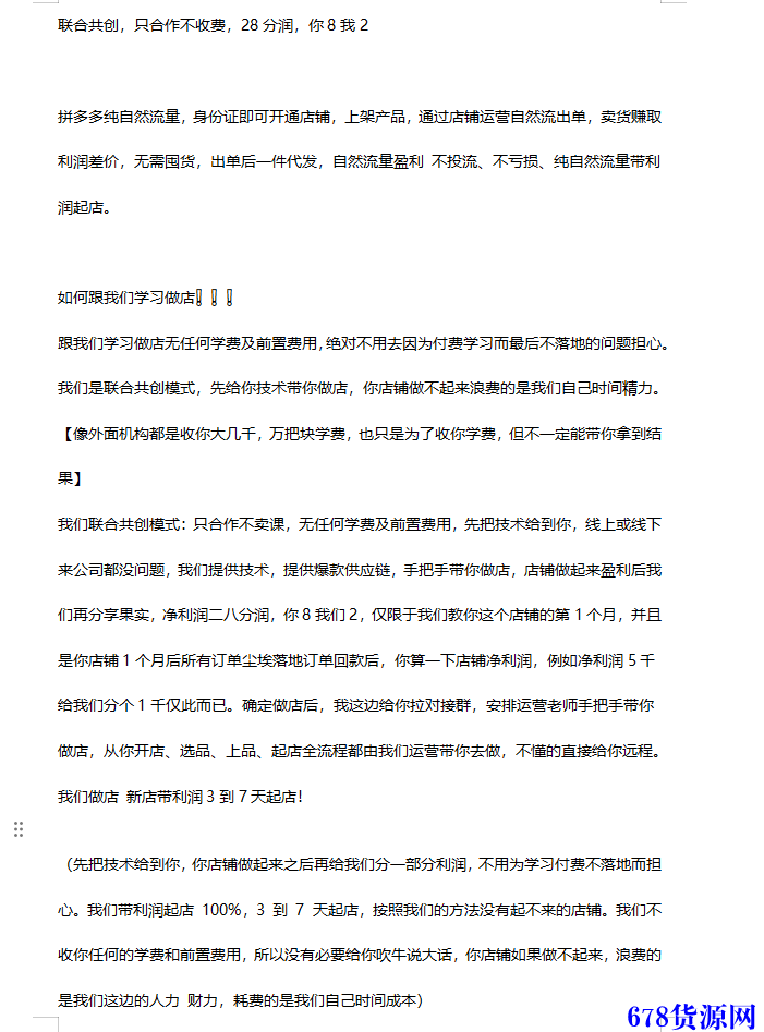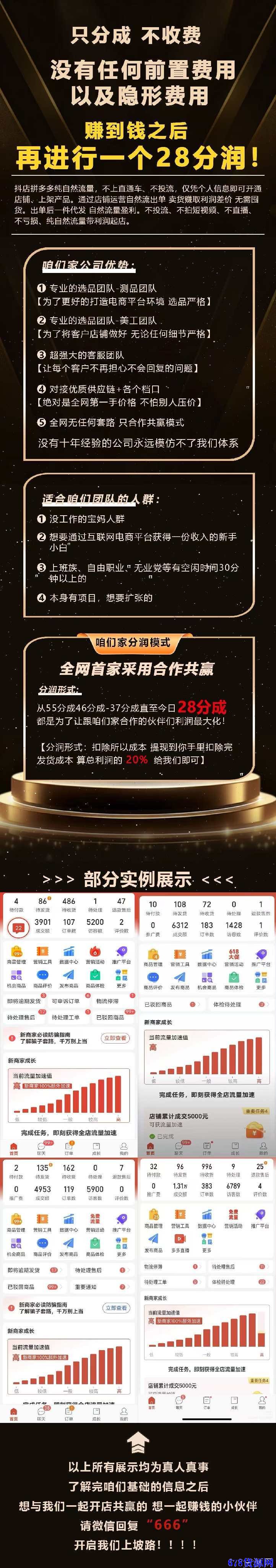 我们联合共创模式:只合作不卖课,无任何学费及前置费用,先把技术给到你,线上或线下来公司都没问题,我们提供技术,提供爆款供应链,手把手带你做店,店铺做起来盈利后我们再分享果实,净利润二八分润,你8我们2,仅限于我们教你这个店铺的第1个月,并且是你店铺1个月后所有订单尘埃落地订单回款后,你算一下店铺净利润,例如净利润5千给我们分个1千仅此而已。确定做店后,我这边给你拉对接群,安排运营老师手把手带你做店,从你开店、选品、上品、起店全流程都由我们运营带你去做,不懂的直接给你远程。我们做店 新店带利润3到7天起店!